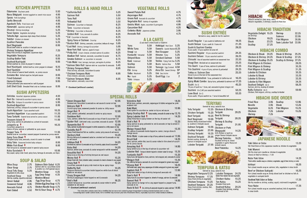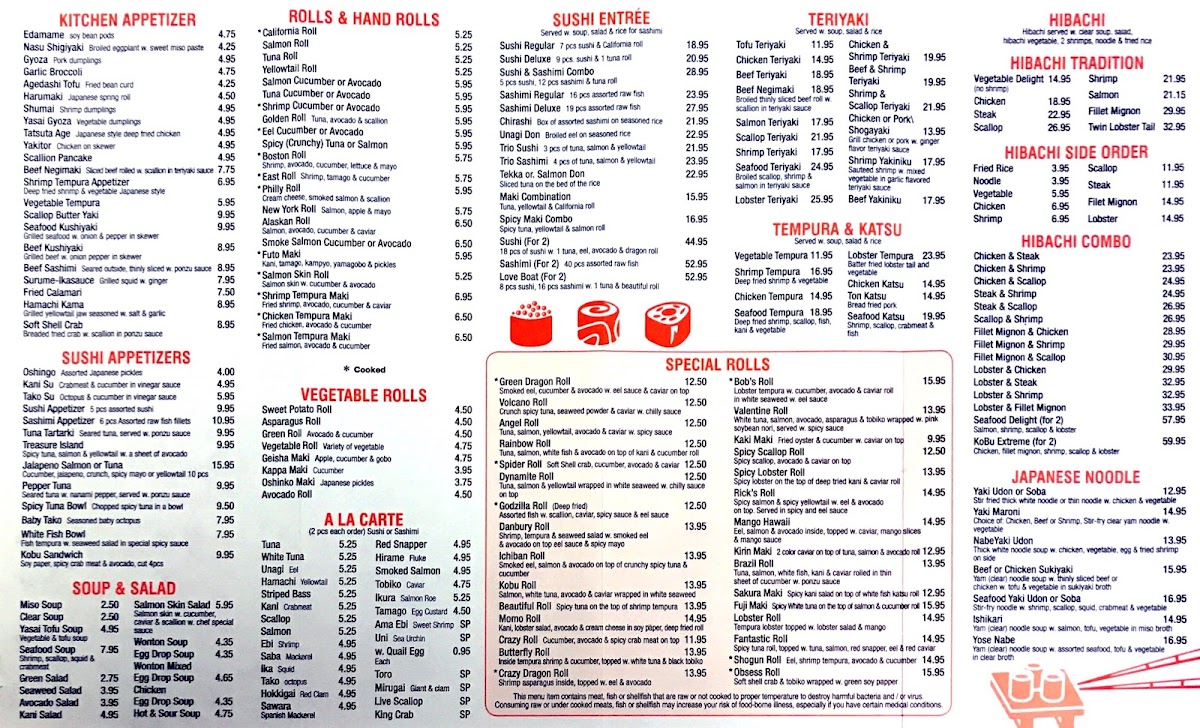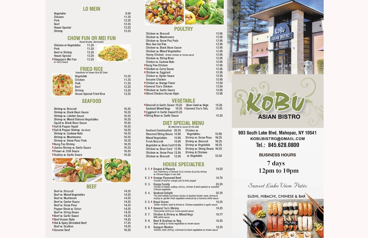 The menu at Kobu Asian Bistro offers a variety of Asian fusion dishes with a focus on Chinese cuisine and sushi. It is organized into several categories allowing guests to select from kitchen appetizers, sushi appetizers, soups, salads, main dishes, and desserts.